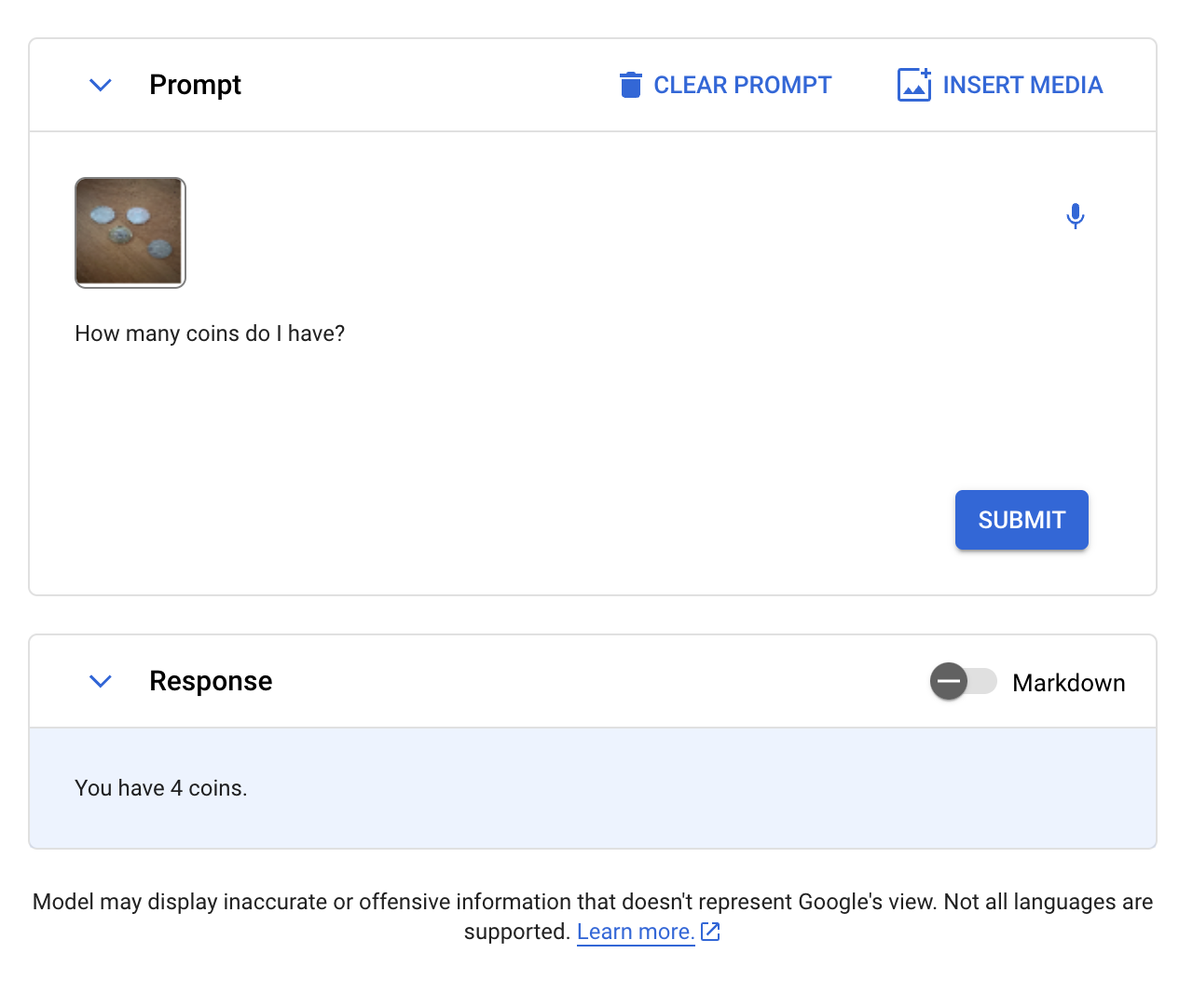 We started with a coin test, asking Gemini “How many coins do I have?”: