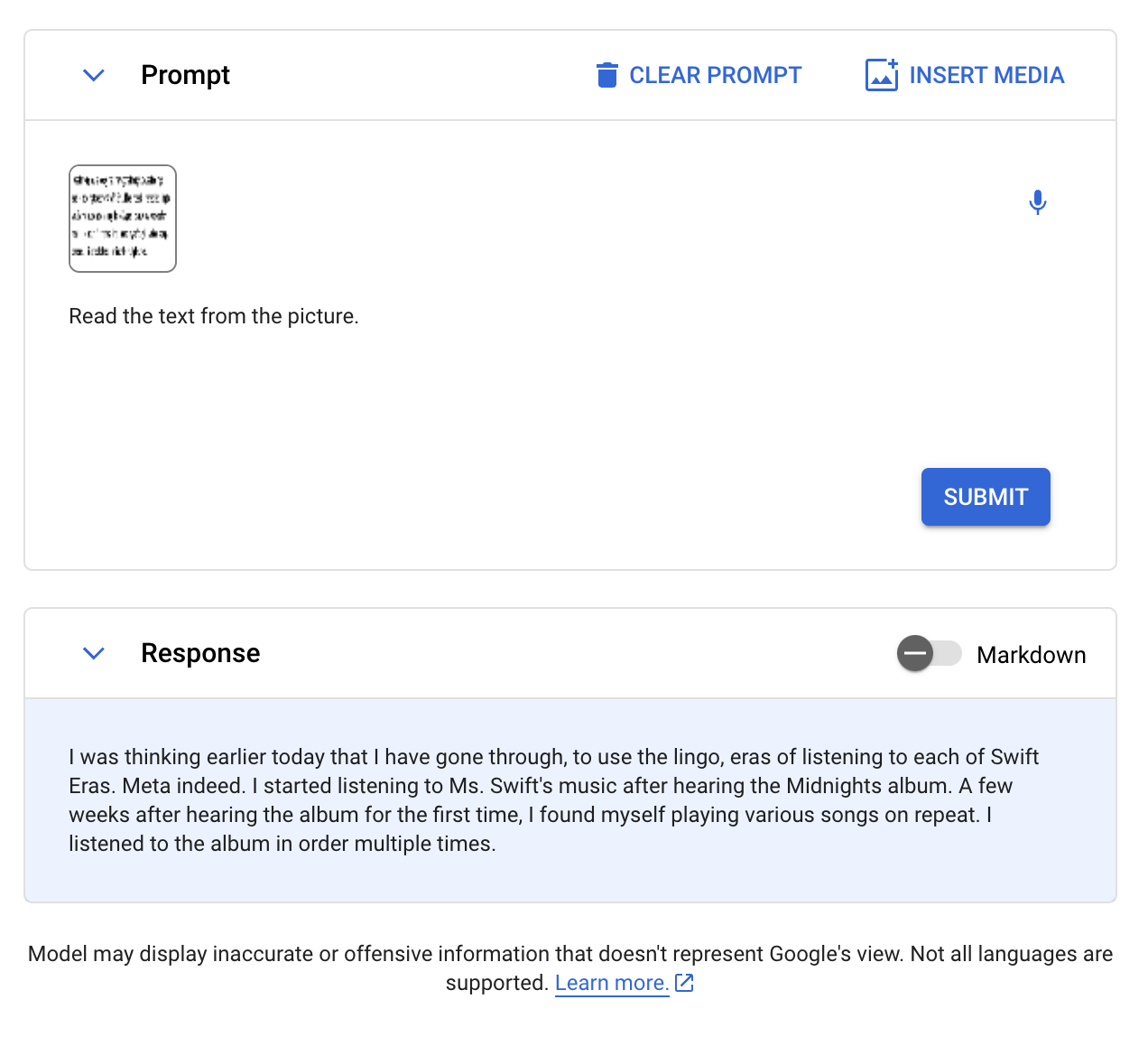 At first, Gemini continually returned “The model will generate a response after you click Submit” with this prompt. We will update this post if we are able to get the test working.