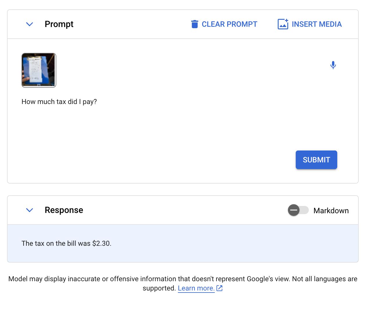 We then asked Gemini to retrieve the amount of tax a receipt states was paid on a meal. Our prompt was “How much tax did I pay?” Here is the image we sent to Gemini: