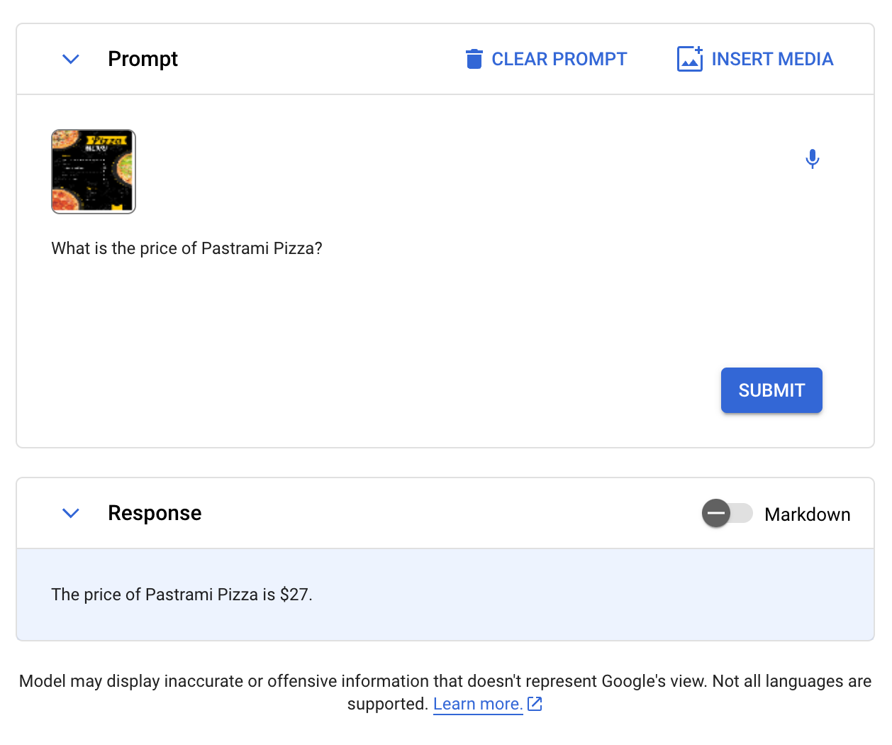We also asked Gemini a question about a menu. Given the menu below, we asked Gemini “What is the price of Pastrami Pizza?”