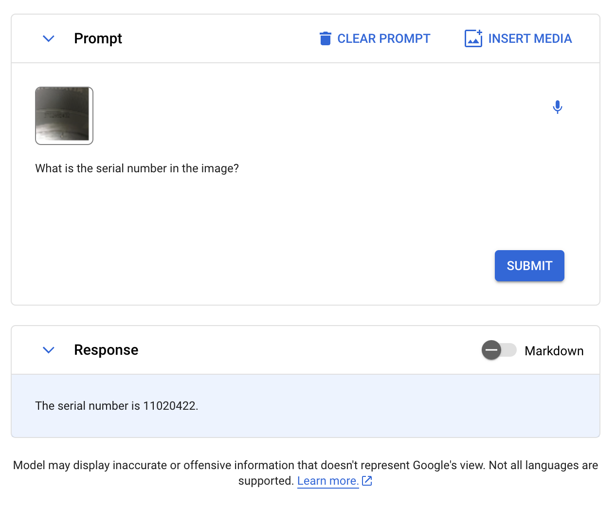 With our standard prompt, “Read the serial number.”, Gemini provided an incorrect response, adding letters that were not present to the serial number. We then revised our prompt to be more specific, asking “What is the serial number in the image?”