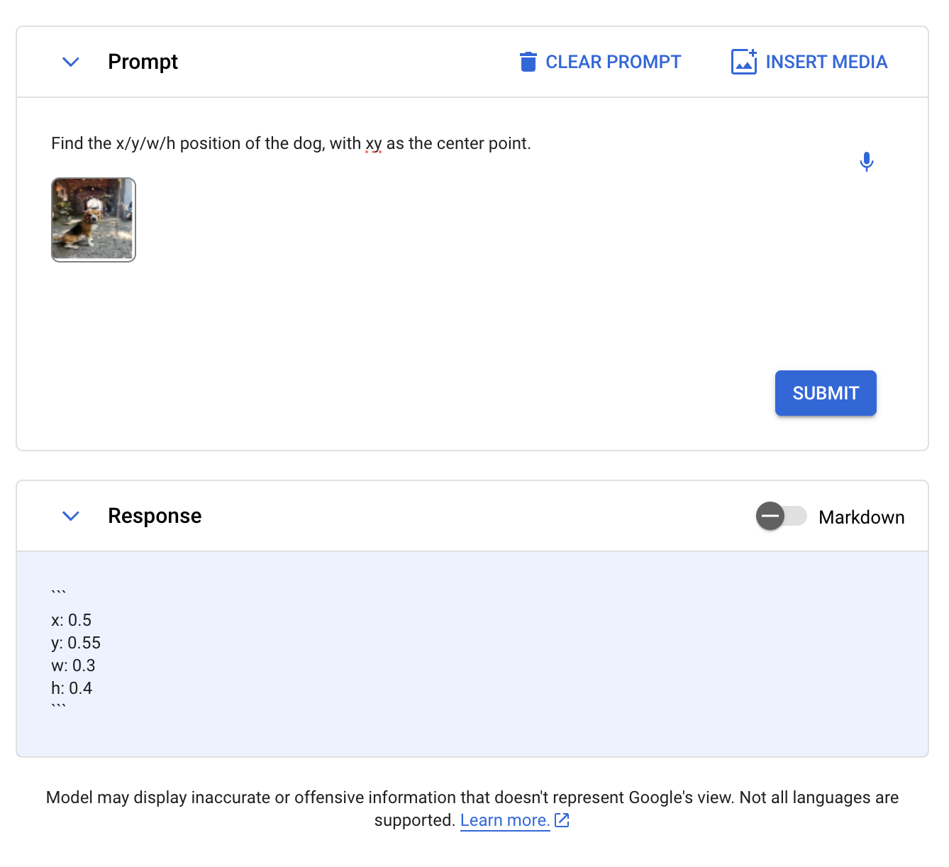 We retried requests and prompts, which we suspect is not related to this task as we have experienced issues running other prompts. We tried the prompt "Find the x/y/w/h position of the dog, with xy as the center point." and received the response: