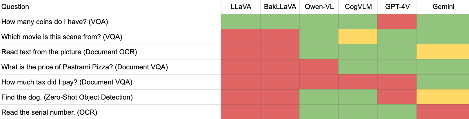 CogVLM, Gemini and GPT-4 with Vision passed this test. LLaVA, BakLLaVA, and Qwen-VL failed the test.
