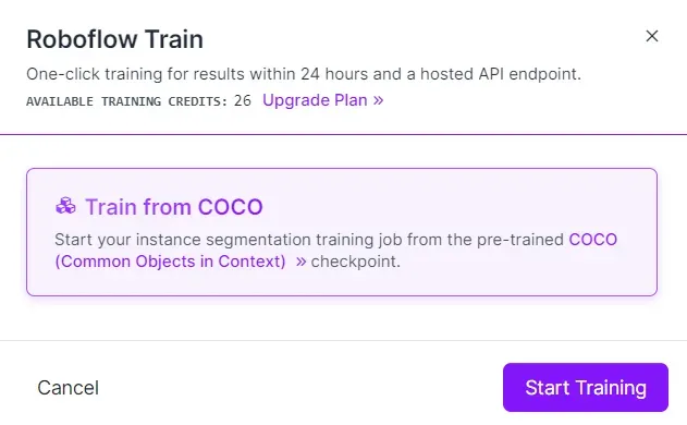 Training computer vision models on Roboflow is incredibly straightforward using Roboflow Train. Once you have created a dataset version, navigate to the dataset version page, where you will find the option "Train a Model." Click on the "Start Training" button, as illustrated below.