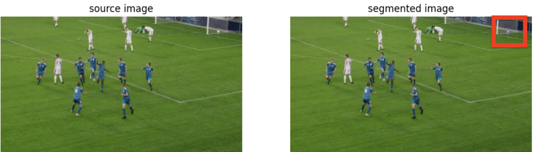Florence-2 also works with smaller objects. Take this example of a soccer pitch. In the image, the ball is small in the goal and easily blends in with the net.