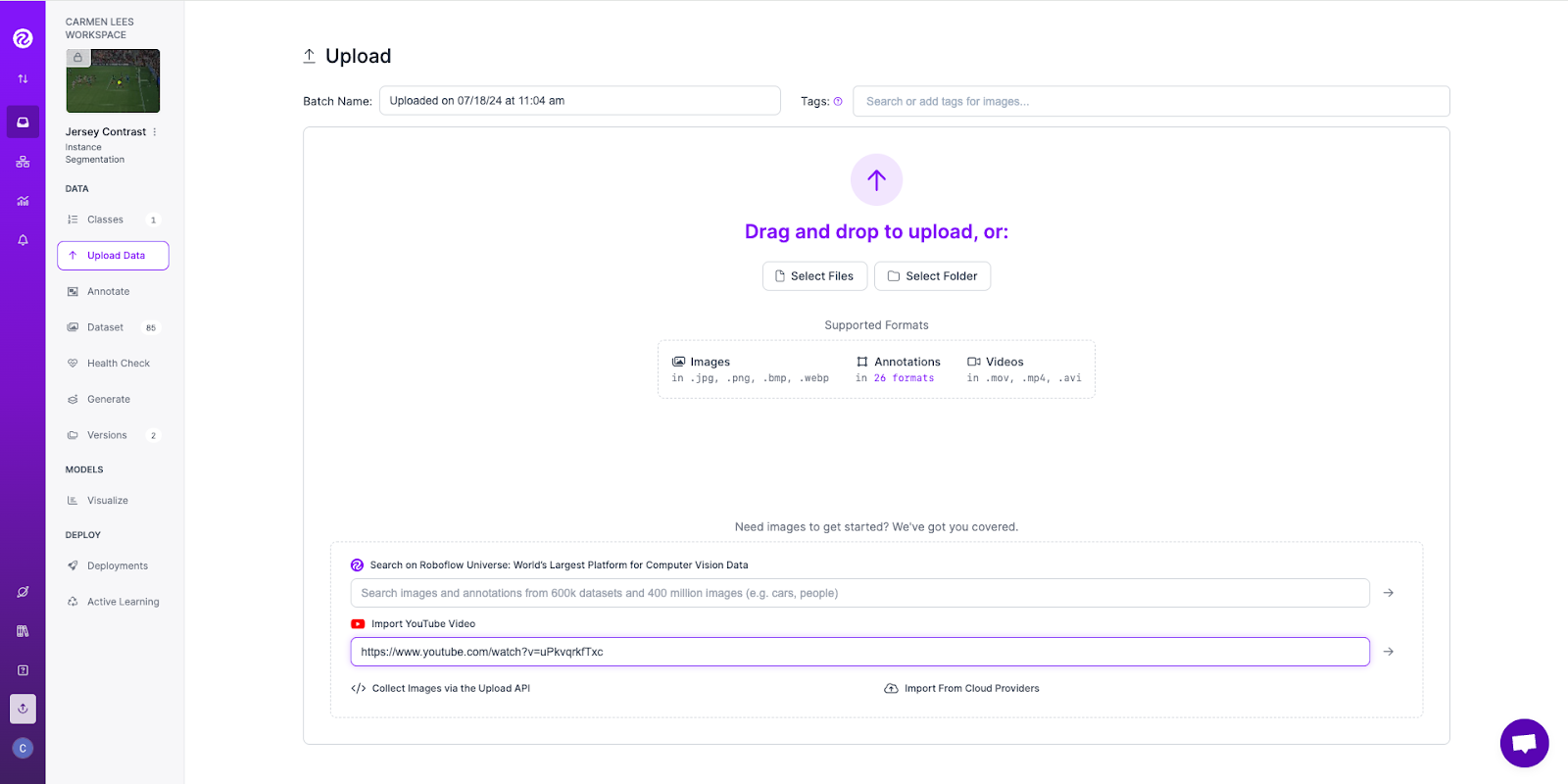 We are going to use computer vision to tell us if the contrast between a jersey’s number and the jersey’s color meets the Web Content Accessibility Guidelines (WCAG) and requirements for color contrast. To do that, we’re going to grab some videos of football players and drop that link into Roboflow.