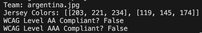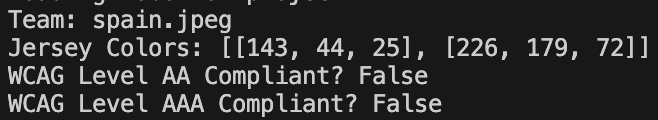 As we can see, the jerseys for Team Spain and Team Argentina both do not pass WCAG2.1 requirements for color contrast.