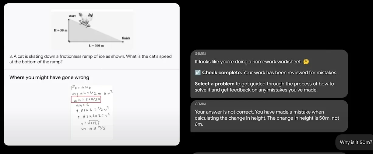 One note we found interesting was this video demonstrating Gemini's ability to correct an example student's math work on an assignment. Here, it draws a box around the part that Gemini believes the student got wrong.