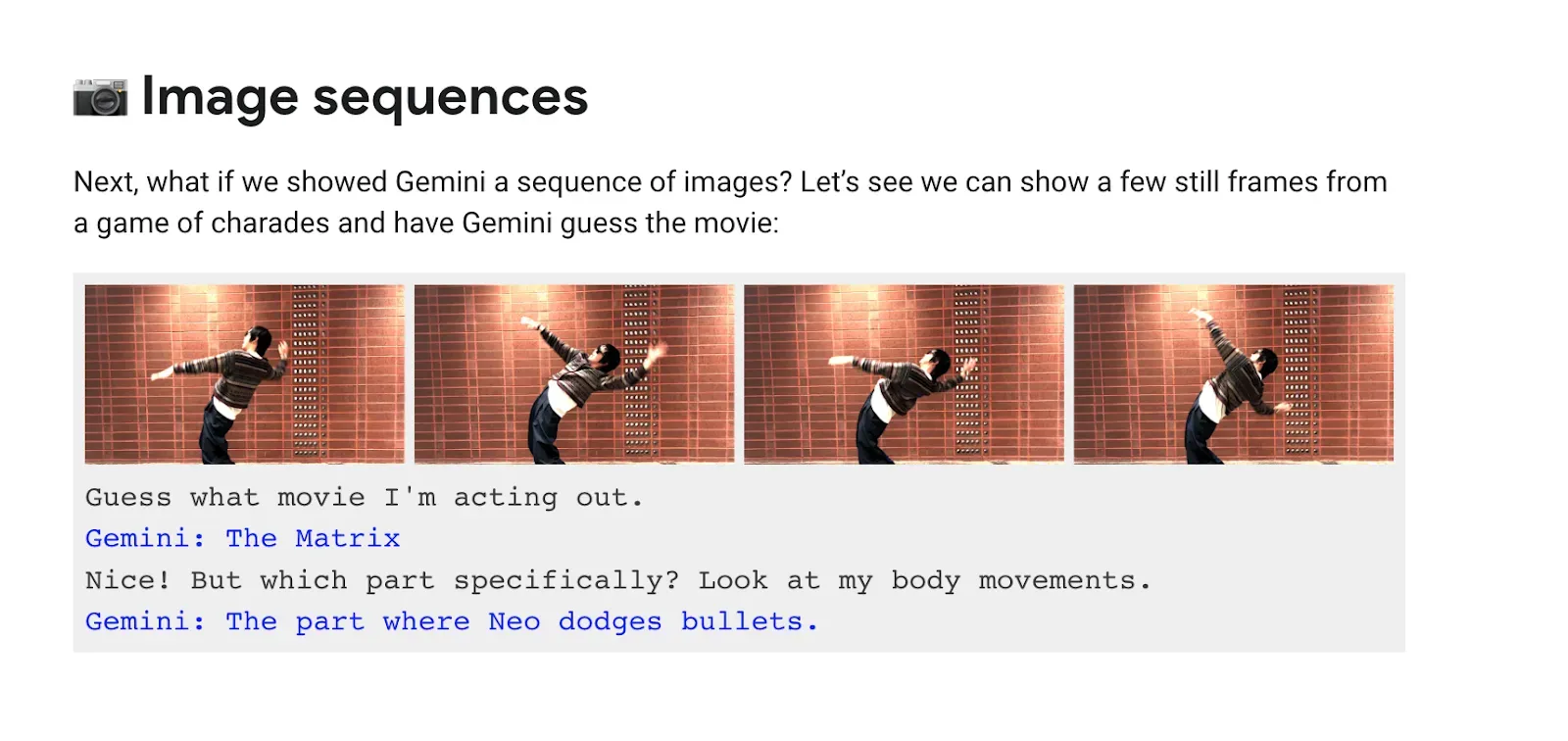 Several other tests are run, including one on image sequences from movies. Google asked Gemini to identify what movie and scene someone was acting out based on four images. The model succeeded: