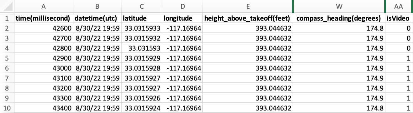 Instead, the best solution I found for how to get data off of a DJI drone is to pull the full flight log data from Airdata by linking your DJI account using these instructions. This gave a CSV file containing telemetry recorded every 100 milliseconds during a flight.