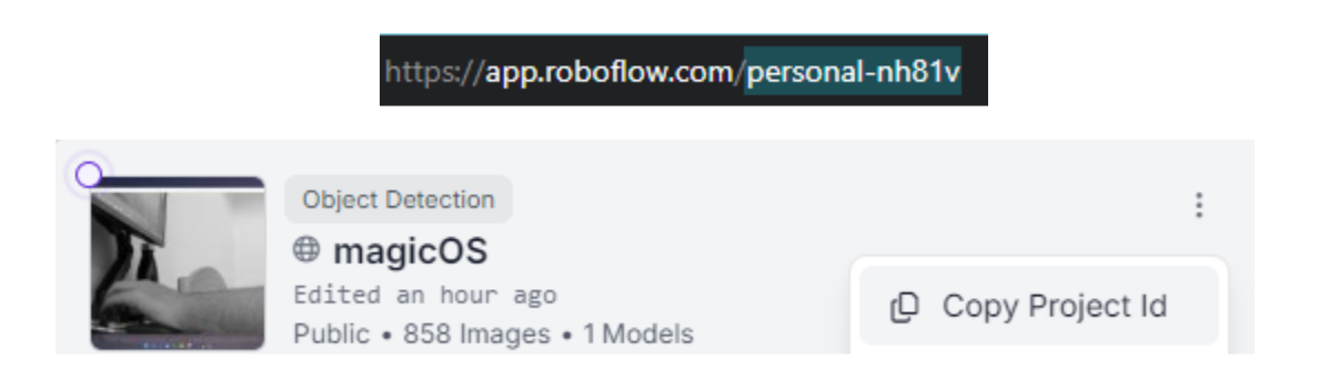 model = project.version(1).modelI used the dotenv and os libraries to hide my Roboflow API key. To do the same, follow this guide: Environment Variables in Python. If you don’t plan to publish the code or show it to anyone, you can remove the import os, import dotenv, and load_dotenv() functions and replace the Roboflow function parameter with your actual API key. You can find it in the workspace setting of your project.