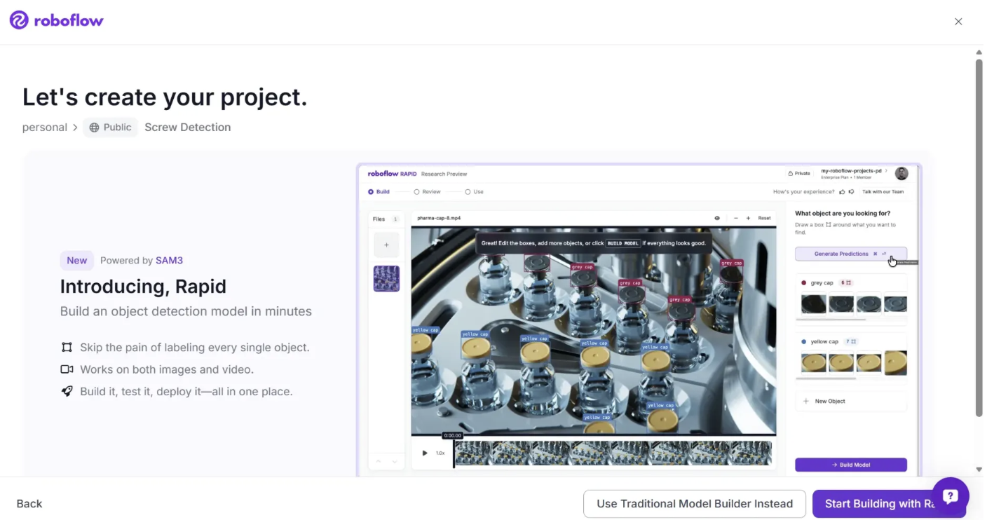 Roboflow Rapid is a prompt based tool that enables the rapid creation of custom computer vision models, primarily for object detection, without requiring manual data labeling.