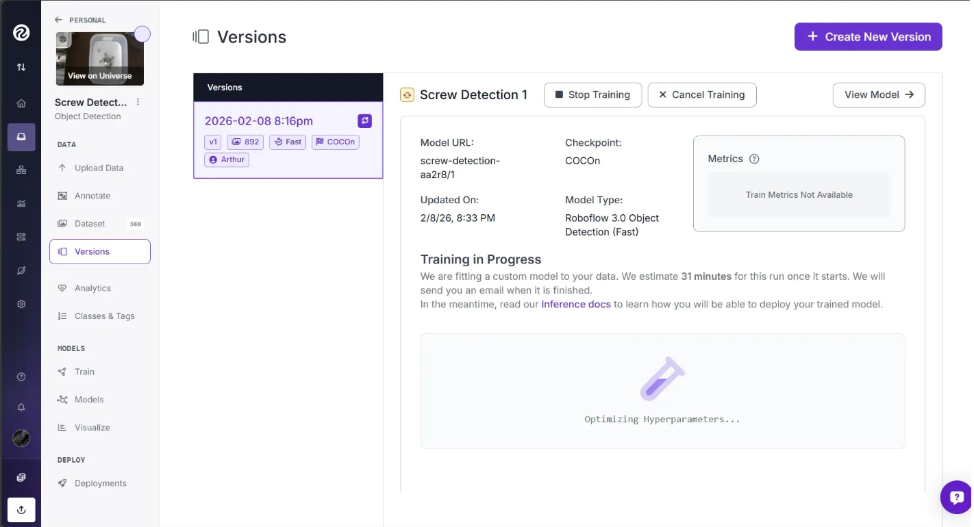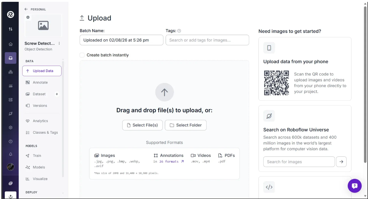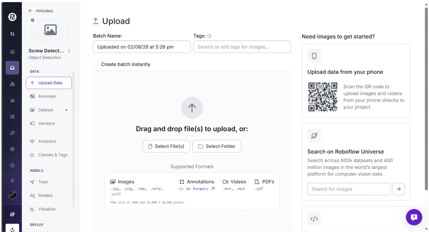 Note: For use cases where an annotated dataset is not available in Roboflow Universe, we recommend starting with at least 5–10 images that include a balanced representation of the classes you want to identify. For example, if you want to detect two types of objects—a screw and a nut—you should have at least 5–10 images that show both objects.