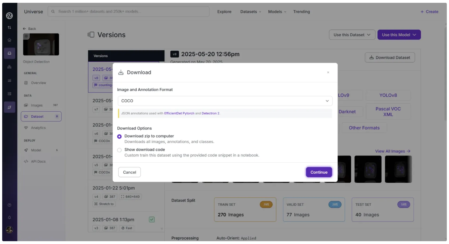 You can also export your dataset to train a model on your own hardware. To export your data, click “Download Dataset” on the Versions page and select your desired export format.