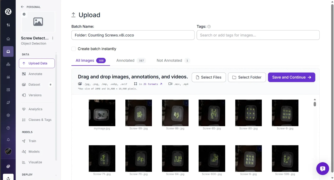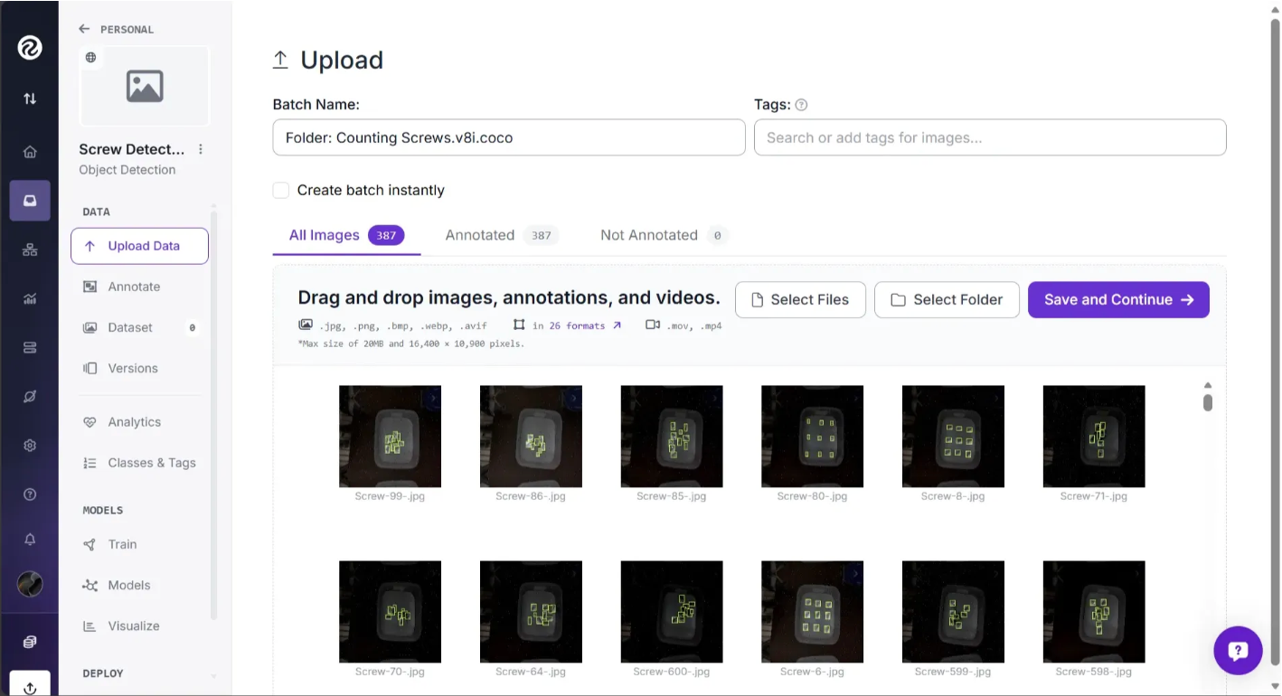 The Counting Screws.v8i.coco folder contains 387 images and their annotations. Once you drag and drop this folder into Roboflow, the images and annotations are processed, and you can see the annotations overlaid on the images, as shown below: