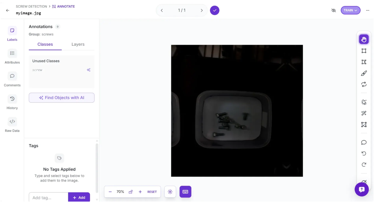 One of the images we uploaded manually, myimage.jpg, in the sample dataset has not been annotated yet. We will use Roboflow Annotate to draw boxes around the unlabeled screws in the image, effectively annotating it.
