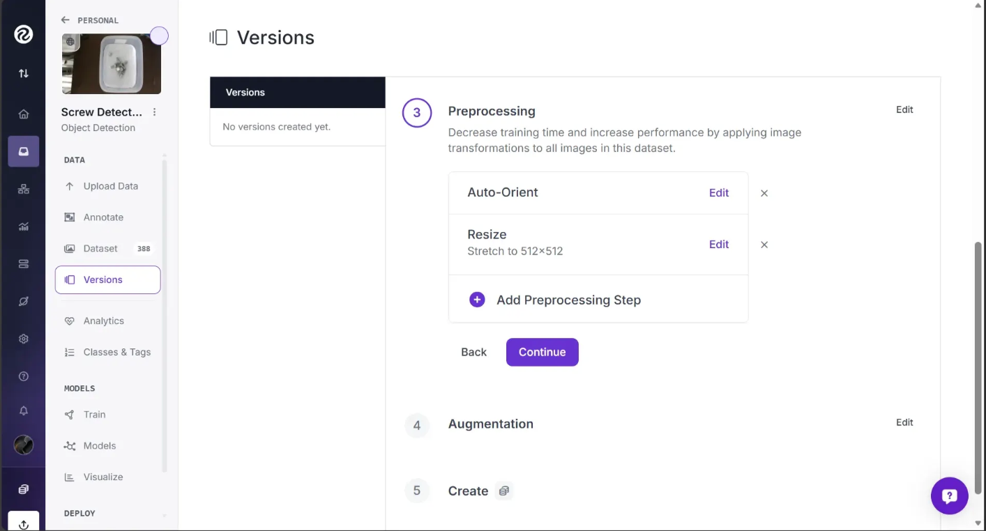 After you’ve finished annotating and added your image to the dataset, proceed to generate a new version of your dataset. This creates a point in time snapshot of your images processed in a specific way, think of it like version control for data. To create the new version, start by navigating to the “Versions” section of the page as shown below: