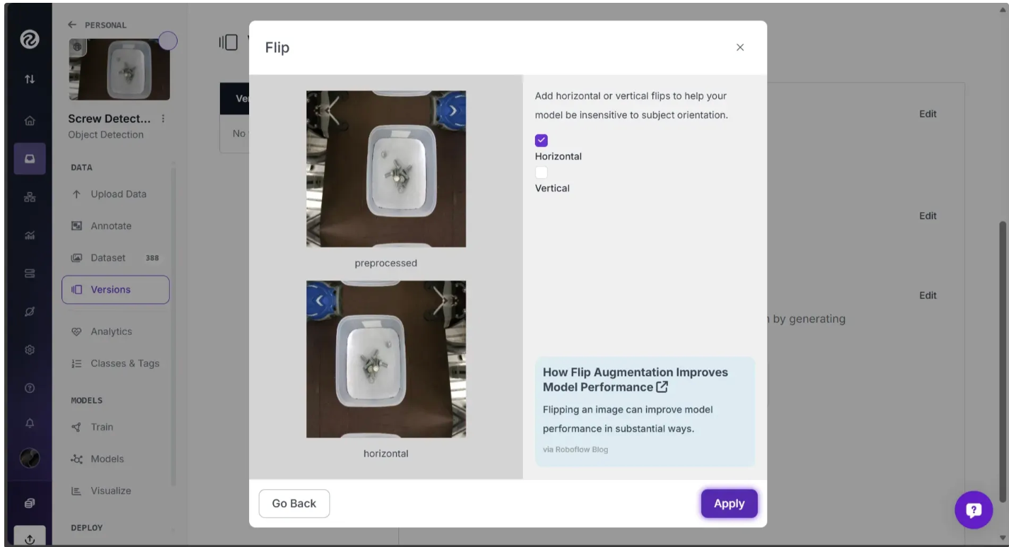 For this project, we are going to apply two augmentations: Flip and Rotate. We recommend these augmentations for our screw dataset since screws can appear at any angle and we want to identify a screw no matter how it is positioned.