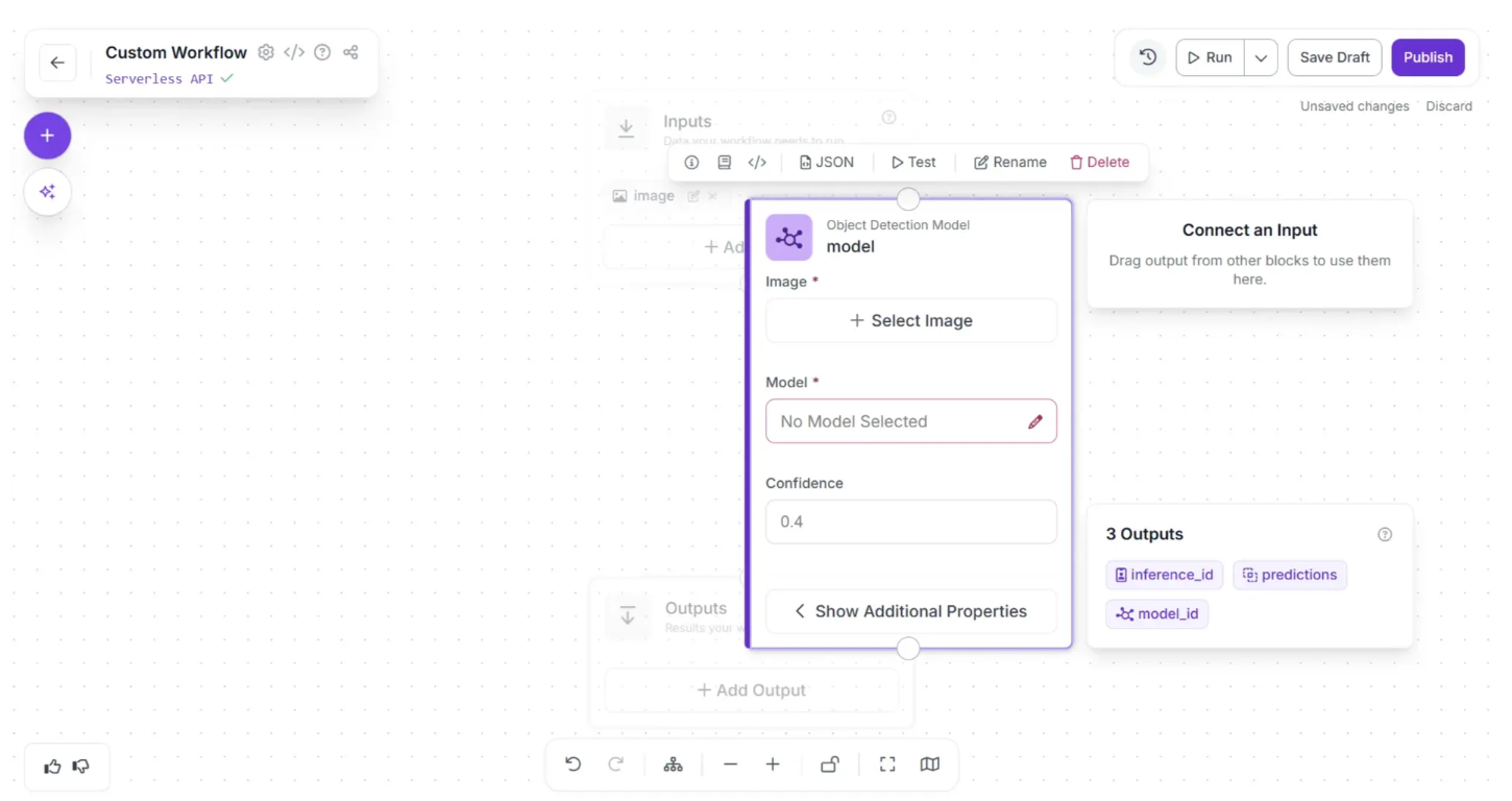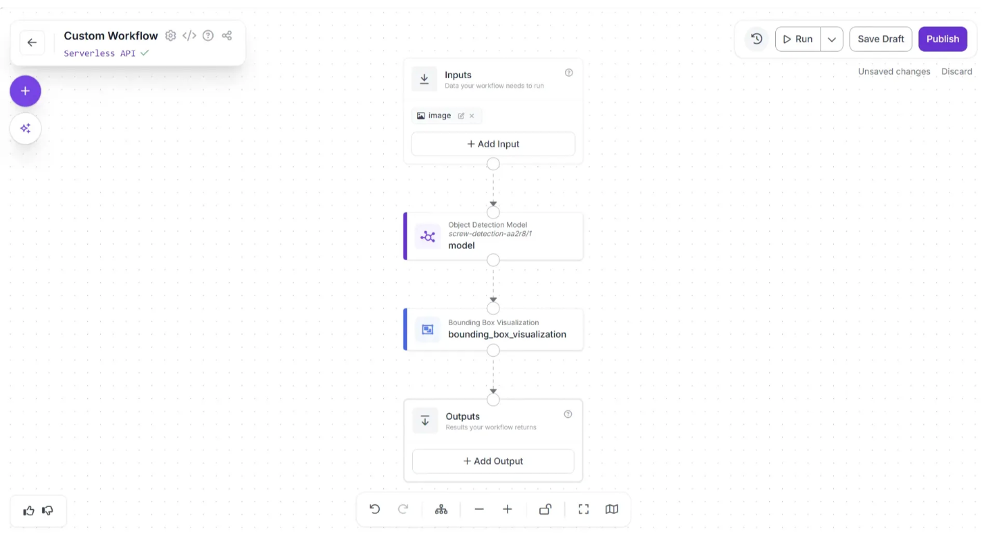 In this guide, we will build a Workflow that runs inference on the previously trained model and outputs a visualized image showing the detected objects, in our case, screws. Here is the workflow we're building.