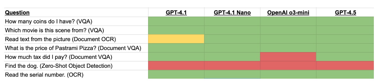 The base GPT-4.1 model passed five of seven of our tests. The model struggled with object detection, although this was not a surprise given many multimodal models struggle with this task too.