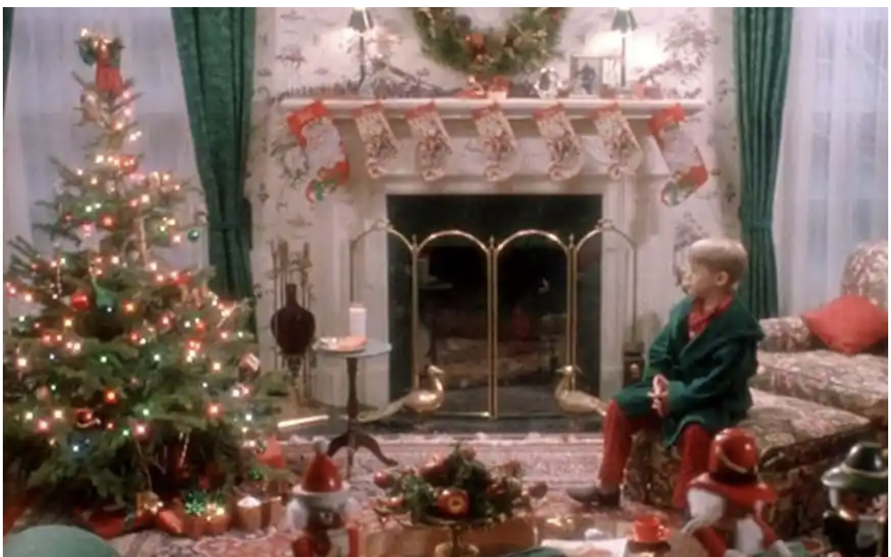 This scene is from the movie "Home Alone." It is a classic Christmas film featuring the character Kevin McCallister, played by Macaulay Culkin.