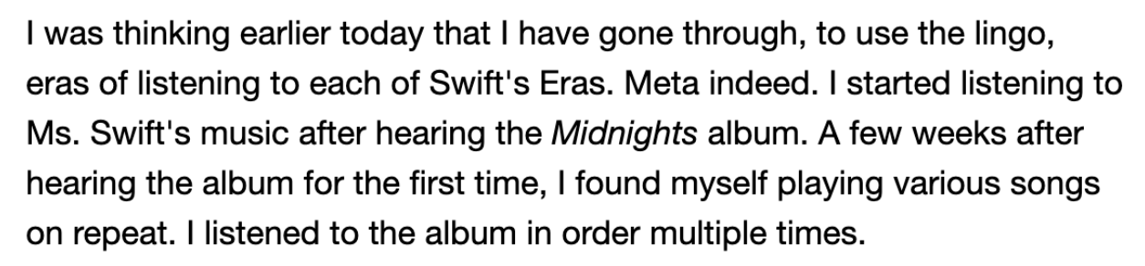 I was thinking earlier today that I have gone through, to use the lingo, eras of listening to each of Swift's Eras. Meta indeed. I started listening to Ms. Swift's music after hearing the Midnights album. A few weeks after hearing the album for the first time, I found myself playing various songs on repeat. I listened to the album in order multiple times.