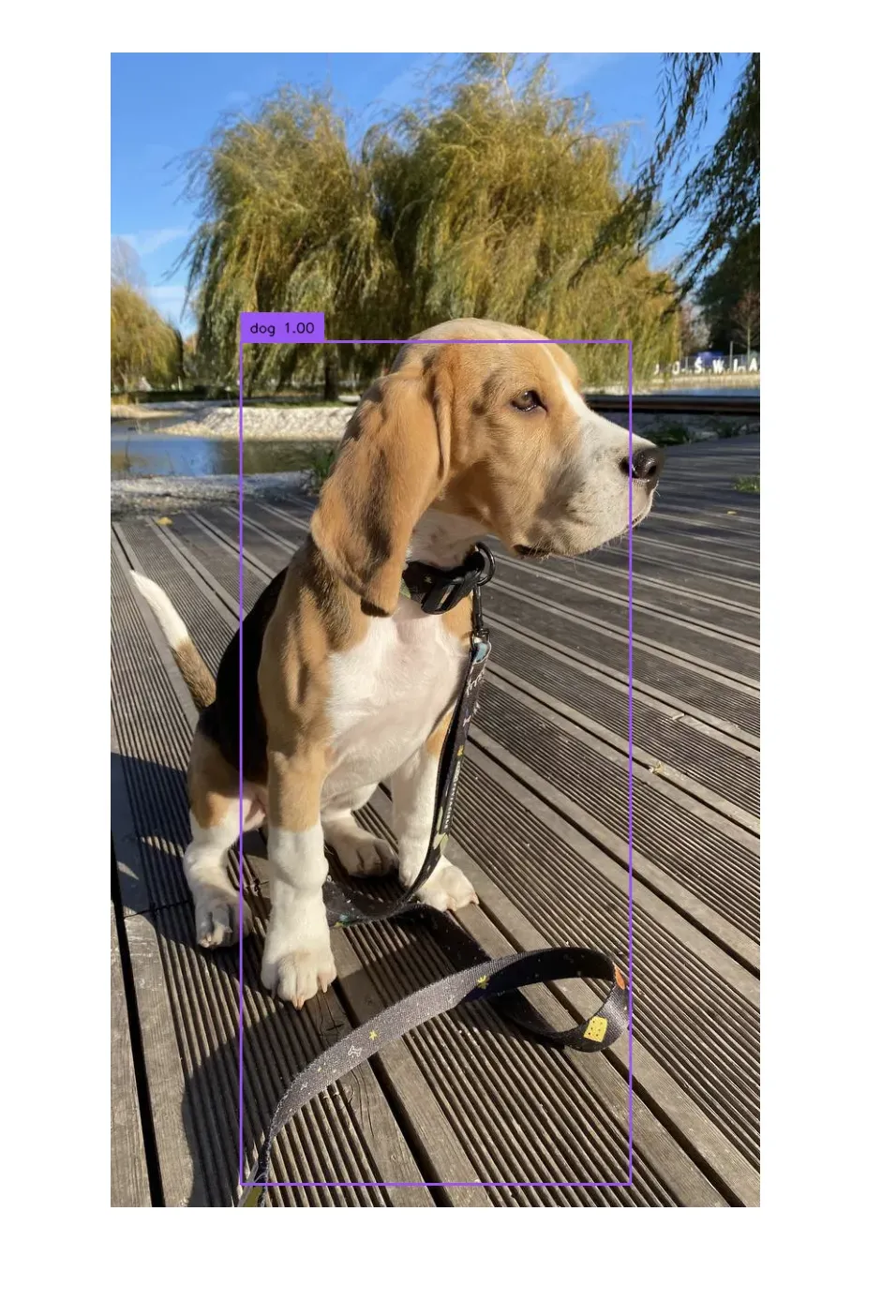 The image shows a beagle dog sitting on a wooden deck. The dog is looking to the side and appears calm and attentive. It is wearing a collar with a leash attached, but the leash is lying on the ground, suggesting that the dog is not currently being held. The surroundings include willow trees, a body of water, and a clear sky, indicating that the location could be a park or a similar recreational area. It's a sunny day, and the setting looks peaceful.
