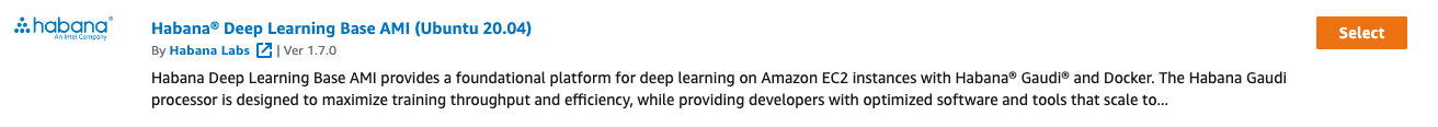 To get started, we launch a dl1.24xlarge instance on AWS. Be sure to launch your instance from the Habana Deep Learning Base AMI in the AWS AMI library to take advantage of all of the Habana and Gaudi pre installations that Intel has provided therein.