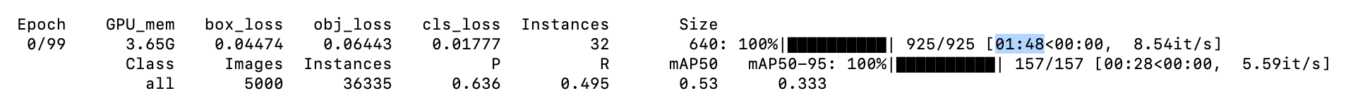 python -m torch.distributed.run --nproc_per_node 8 train.py --batch 128 --data coco.yaml --weights yolov5s.pt --device 0,1,2,3,4,5,6,7During training, we witness a 1 minute 48 seconds epoch time:
