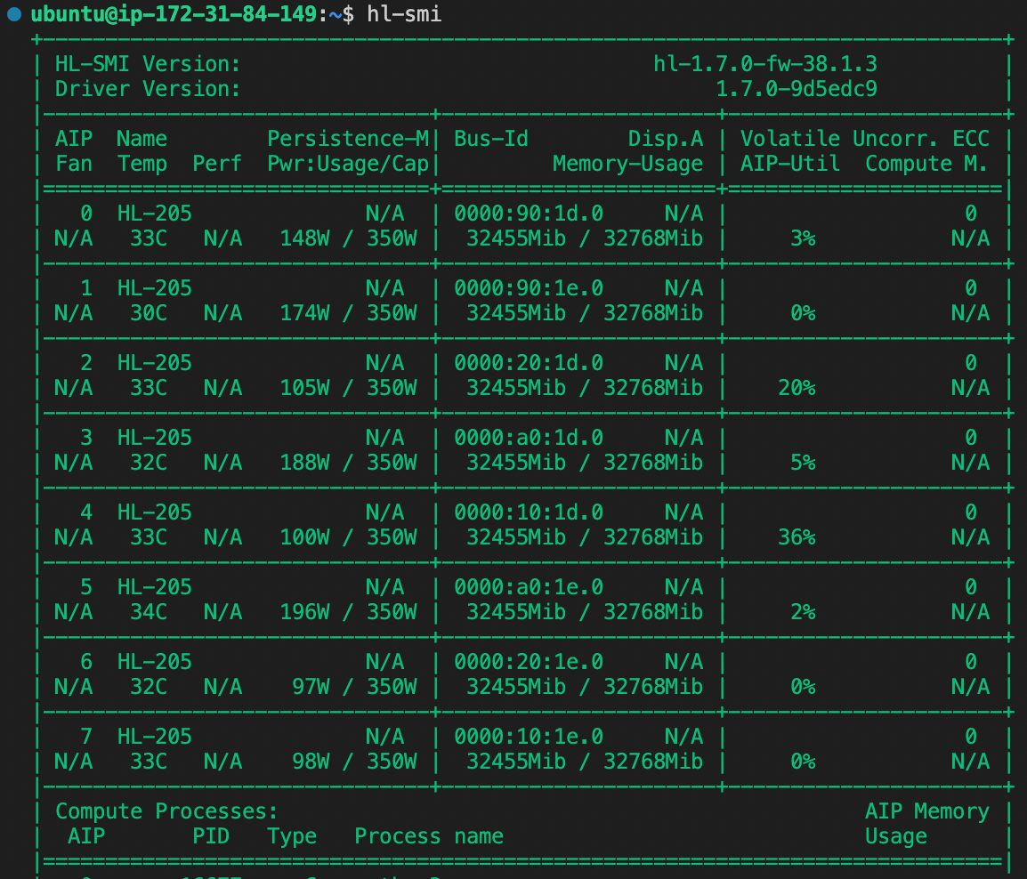 To check if we are utilizing all of the HPU cards we run hl-smi -l. These checks show utilization across all cards with the HPU memory saturated. AIP-Util is not shown to be maxed out on every card, perhaps suggesting there is some additional performance gain to be realized in the training configuration.
