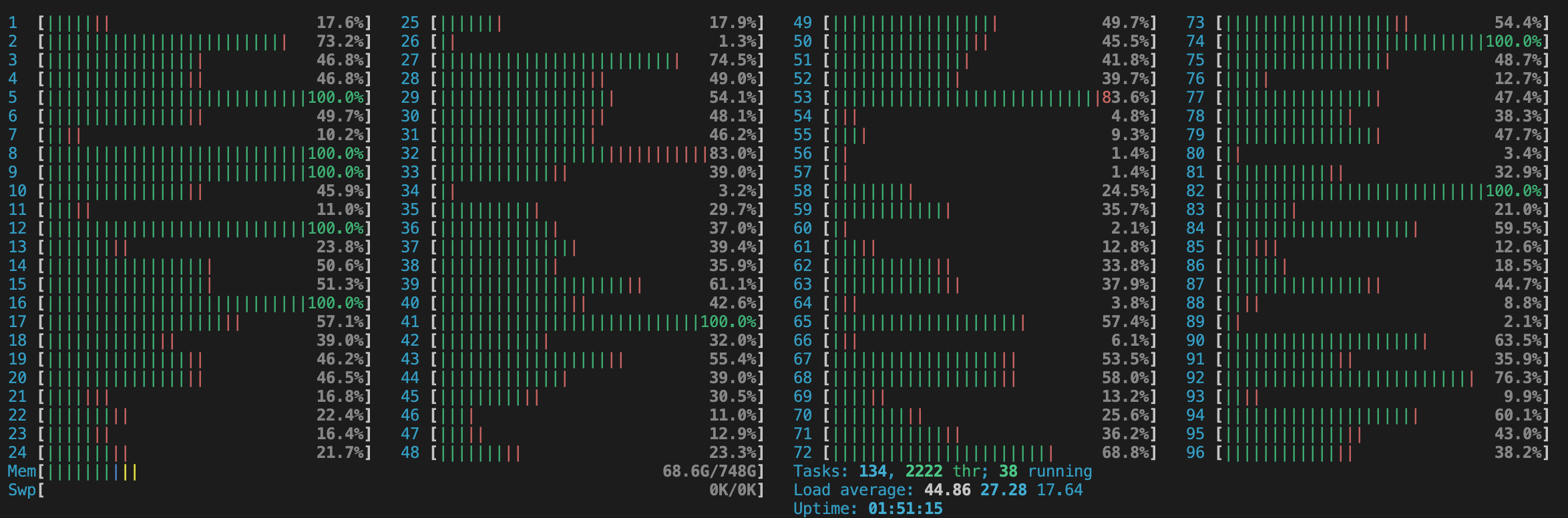 We can also see that all of our CPUs are utilized with htop.