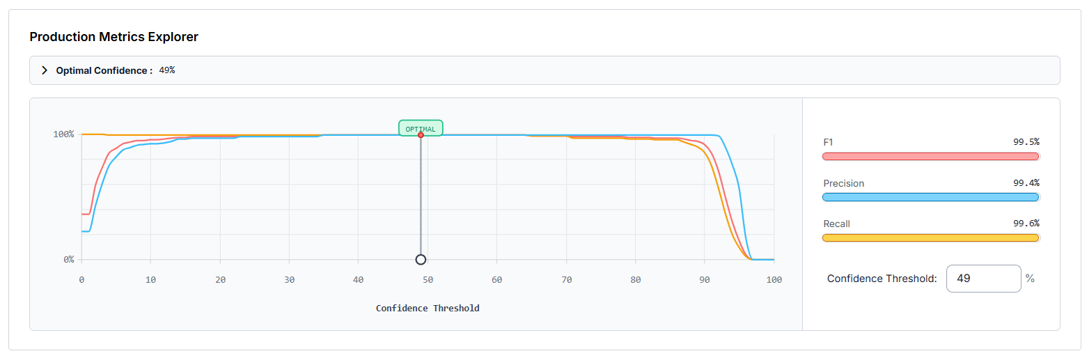 You can use the "Production Metrics Explorer" to find the best confidence setting for your model. The chart shows how precision, recall, and F1 score change as the confidence threshold moves. The optimal confidence point is marked to help you choose the best balance between catching all objects and avoiding false detections.