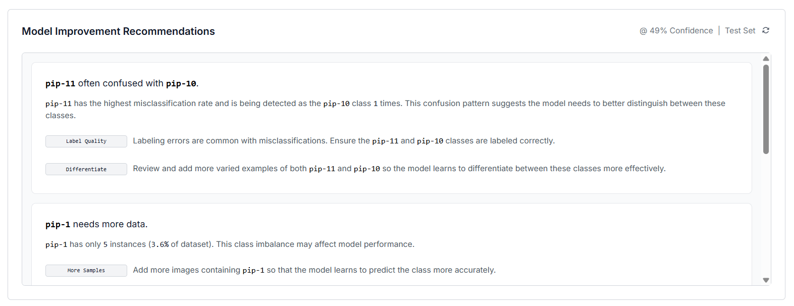 The "Model Improvement Recommendations" section automatically analyzes your model’s training results and suggests practical ways to improve performance. It highlights issues such as class confusion (when the model mixes up similar categories), data imbalance (when some classes have too few images), and small or unbalanced dataset splits. For each issue, it gives clear guidance, such as add more examples, improve label quality, or adjust data splits which helps you make your dataset stronger and your model more accurate in future training rounds.