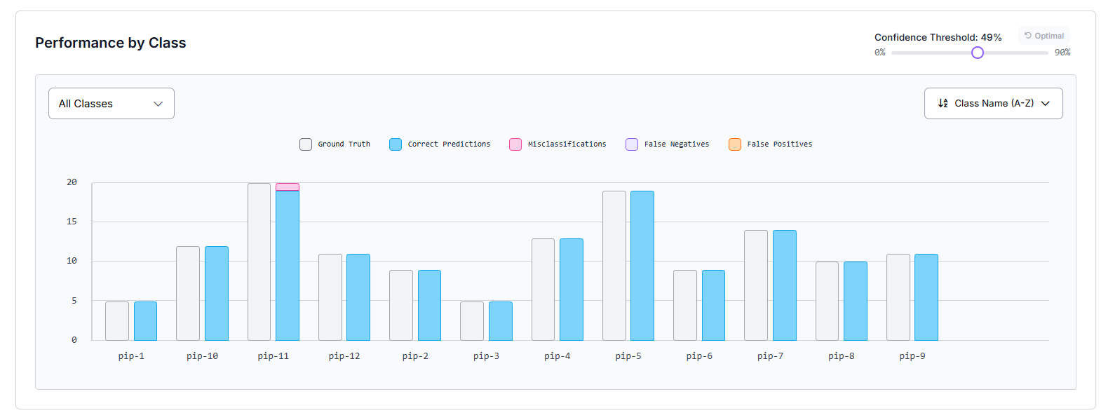 "Performance by Class" shows how well your model performs for each class. Each bar compares how many objects were correctly detected versus missed or misclassified, helping you quickly see which classes are performing well, and which need more training data or better labeling.