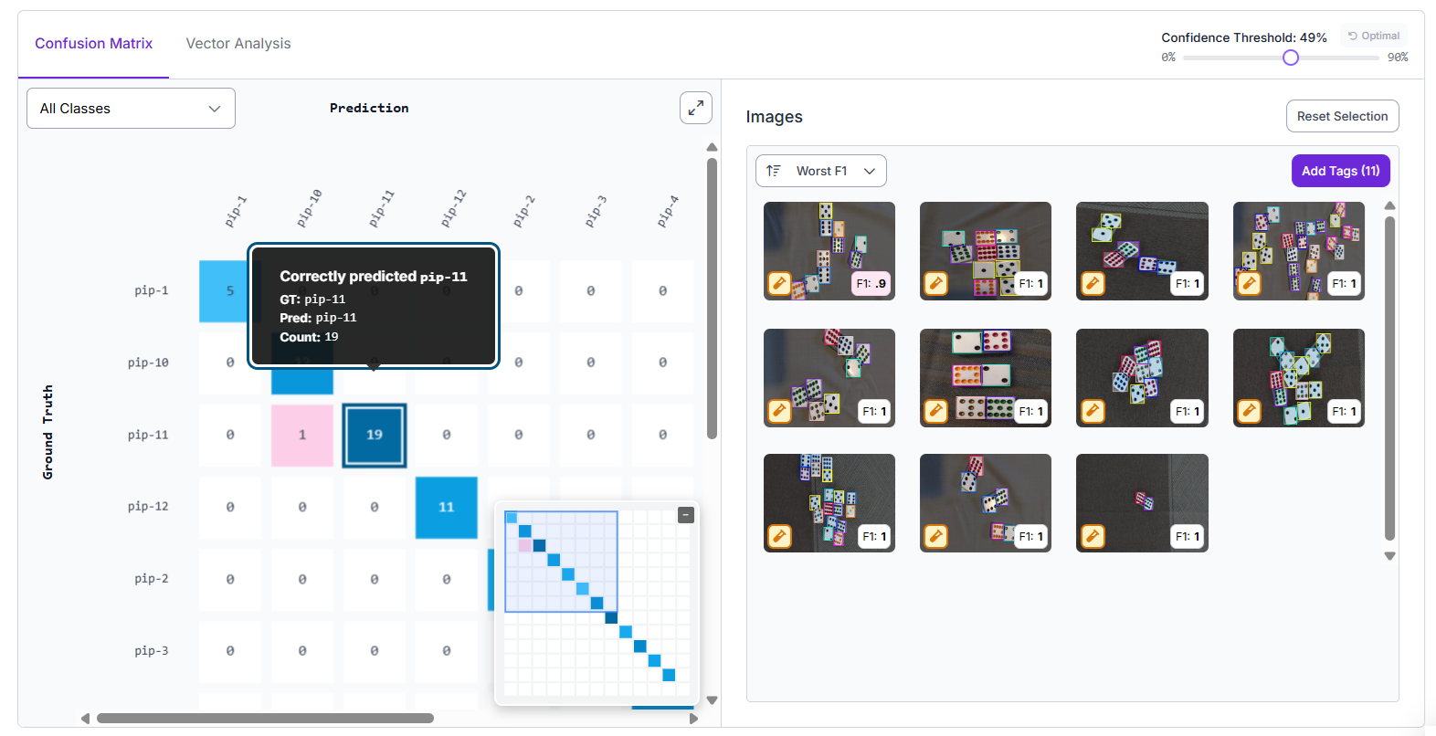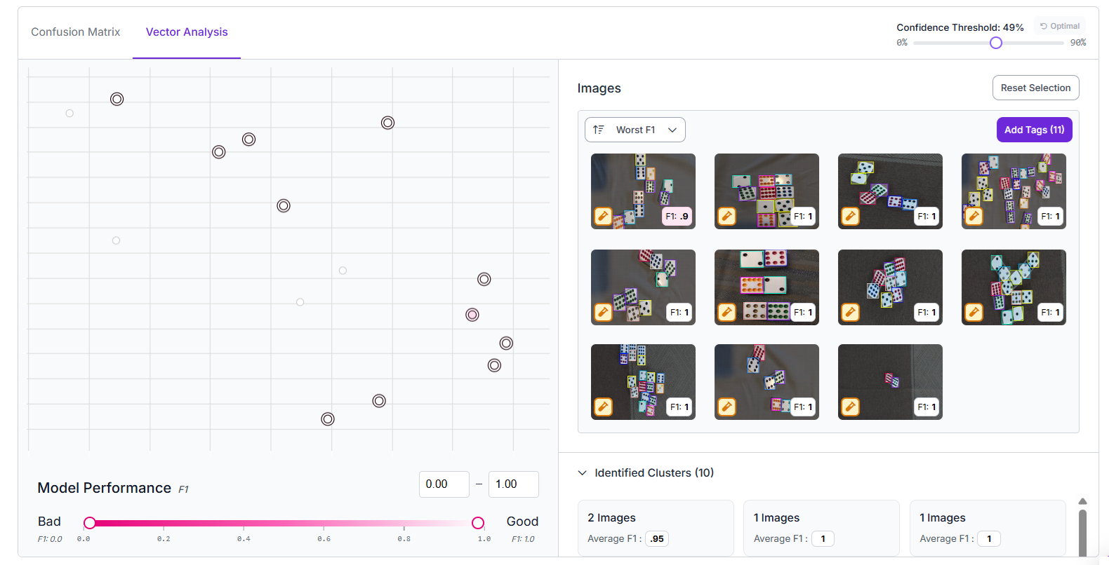 The "Vector Analysis" view plots every image as a point to show how well the model performed on it. Images with low scores are easy to spot, so you can find clusters of weak predictions. It’s a quick visual way to identify difficult cases or labeling problems that can be fixed to improve accuracy.