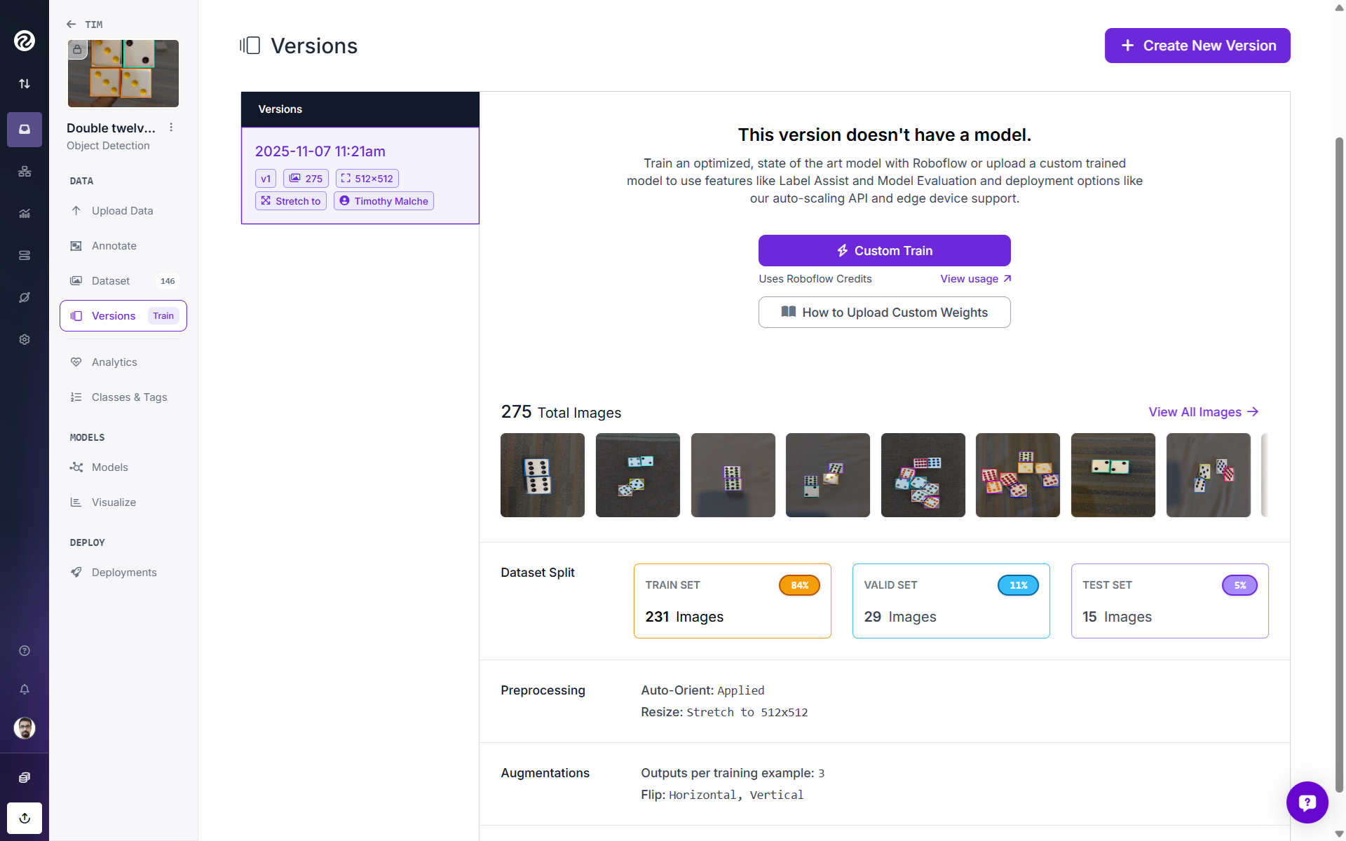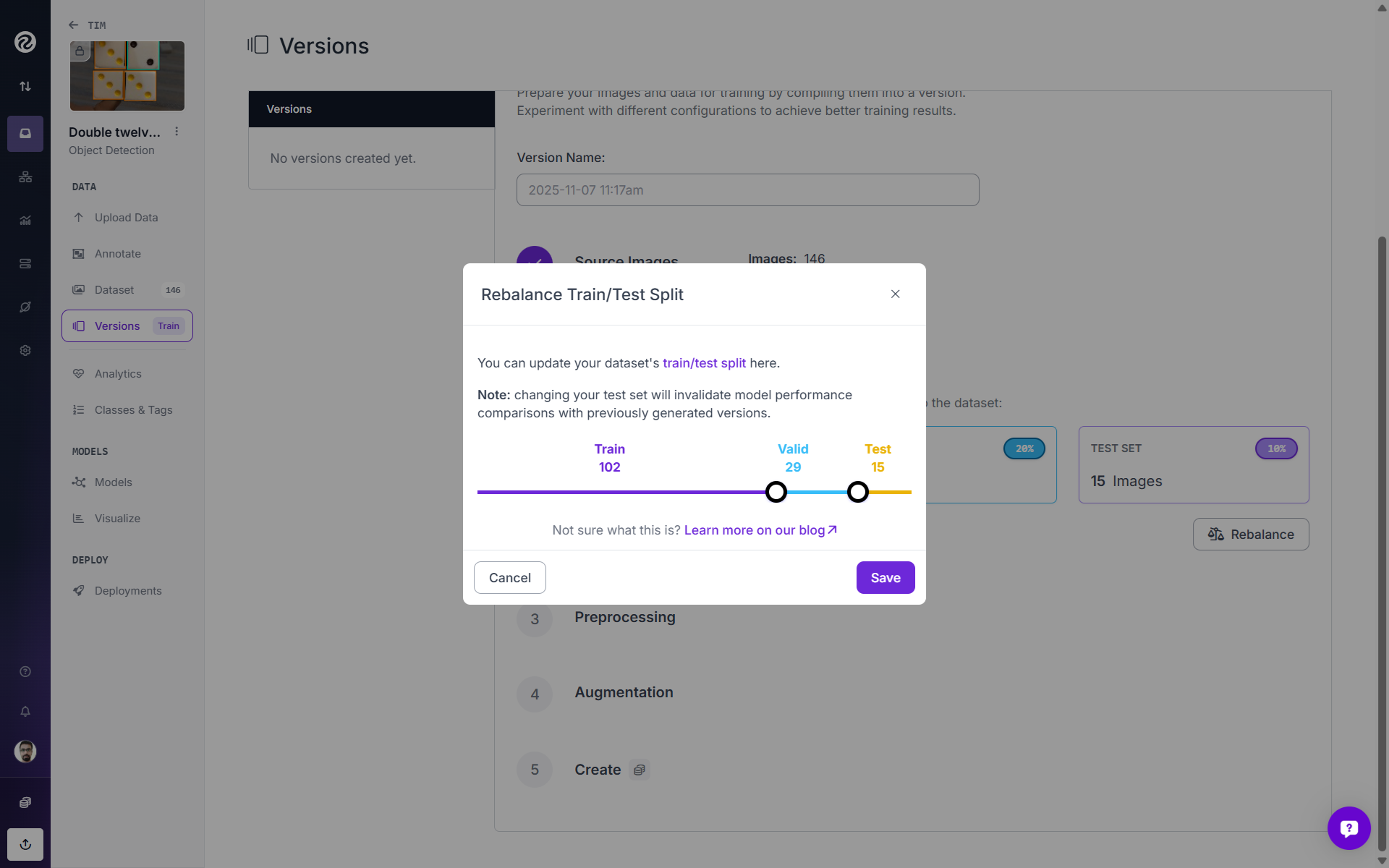 After the dataset is labeled, create a dataset version. In the “Dataset Version” flow, choose an initial split (e.g., 70 % train, 20 % validation, 10 % test). Roboflow allows stratified splitting by class, and ensures that duplicates are not split across sets. However, you may also rebalance this split manually within the same interface.