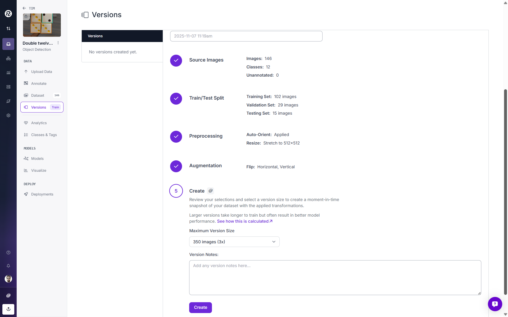 After the split, apply preprocessing steps such as resizing and augmentations (flips, brightness adjustments, and noise). Roboflow applies augmentations offline to the training set, improving reproducibility and reducing GPU idle time. Finally, while creating the dataset version, choose the minimum version size, to increase the sample size.