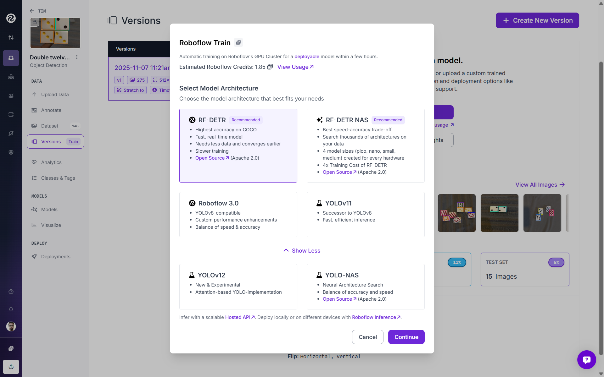 Once the dataset version is created, train the model by clicking the “Custom Train” button. Roboflow offers several detectors; for best accuracy, RF‑DETR is the recommended choice. For this example, I choose RF-DETR.