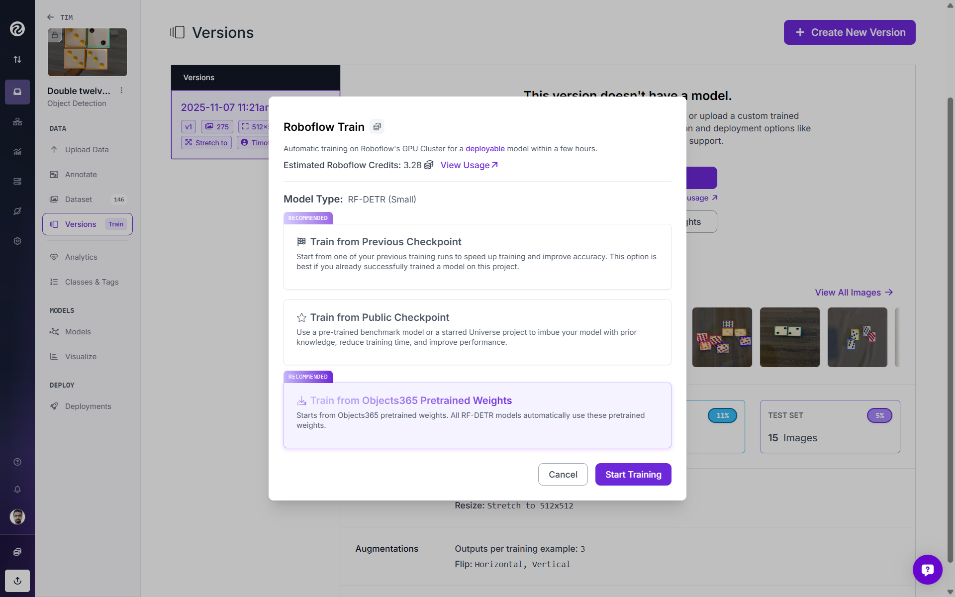 Your next step is to choose your checkpoint. Here, I selected “Train from Objects365 Pretrained Weights”.