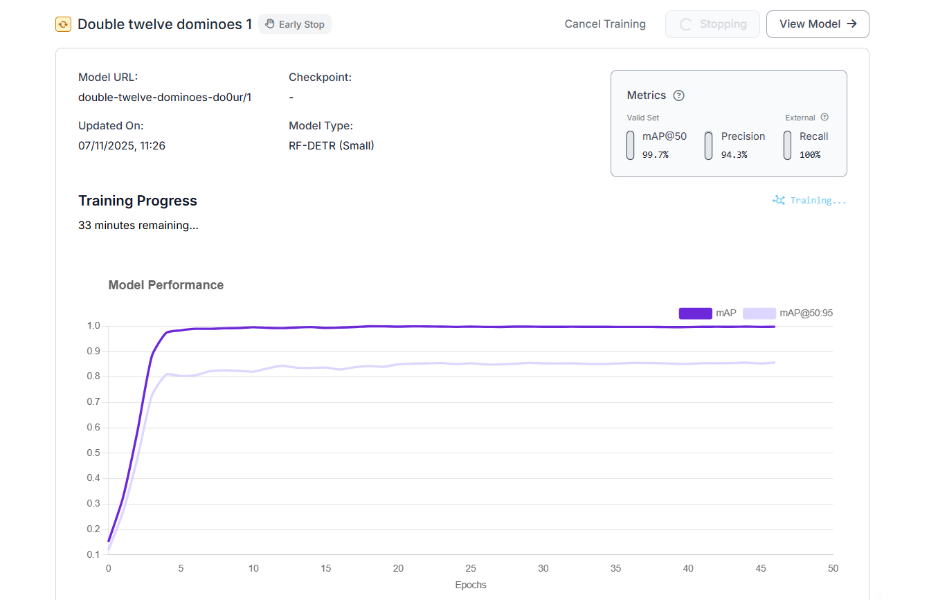 Since my model matrices were looking fine after a few epochs, I clicked “Early Stop” to stop training early and build the model.