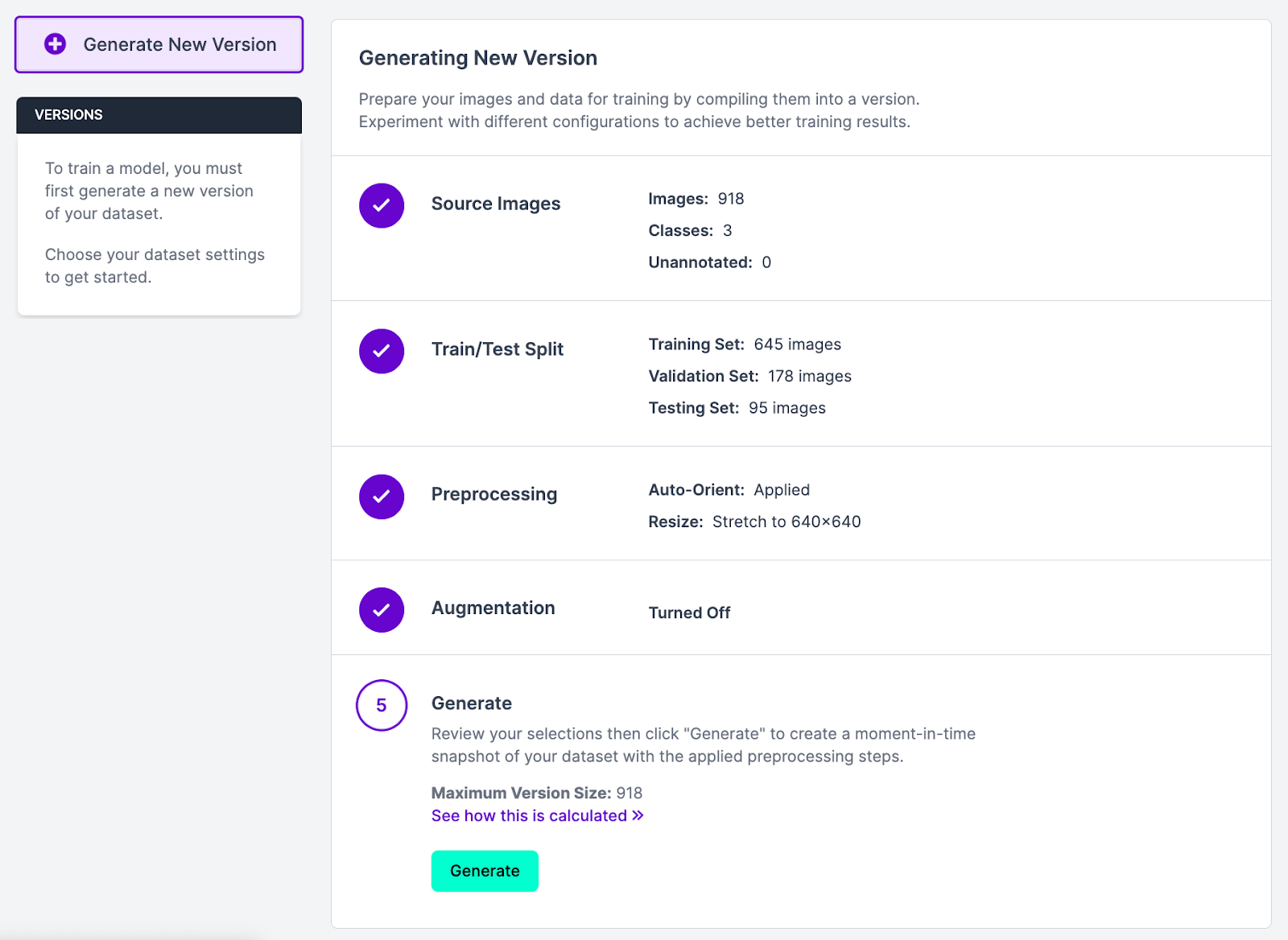 Let’s leave the preprocessing and augmentation values blank for now. At the bottom of the page, click “Generate” to create a version of your dataset.
