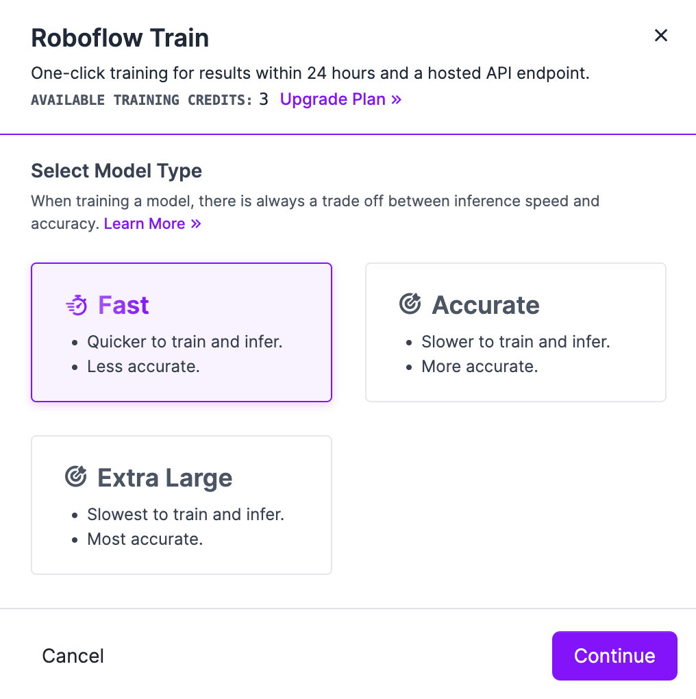 You can train computer vision models on Roboflow in a few clicks with Roboflow Train. Click “Train a Model'' on the dataset version page to which you were taken after creating a dataset version. You will be asked to select a training option. Choose “Fast”: