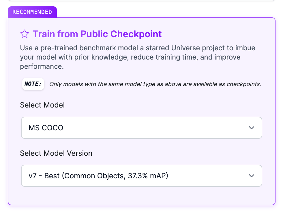 In the next pop up, choose the “Train from Public Checkpoint” option and make sure “MS COCO” is selected. We recommend training from the MS COCO checkpoint for the first version of your model.