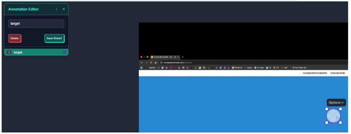 For this project, we’ll need a computer vision model that’s able to detect various targets, so we can automate the mouse tracking to click on them. For this, prepare some sample data by screen recording a personal attempt at the aiming challenge: