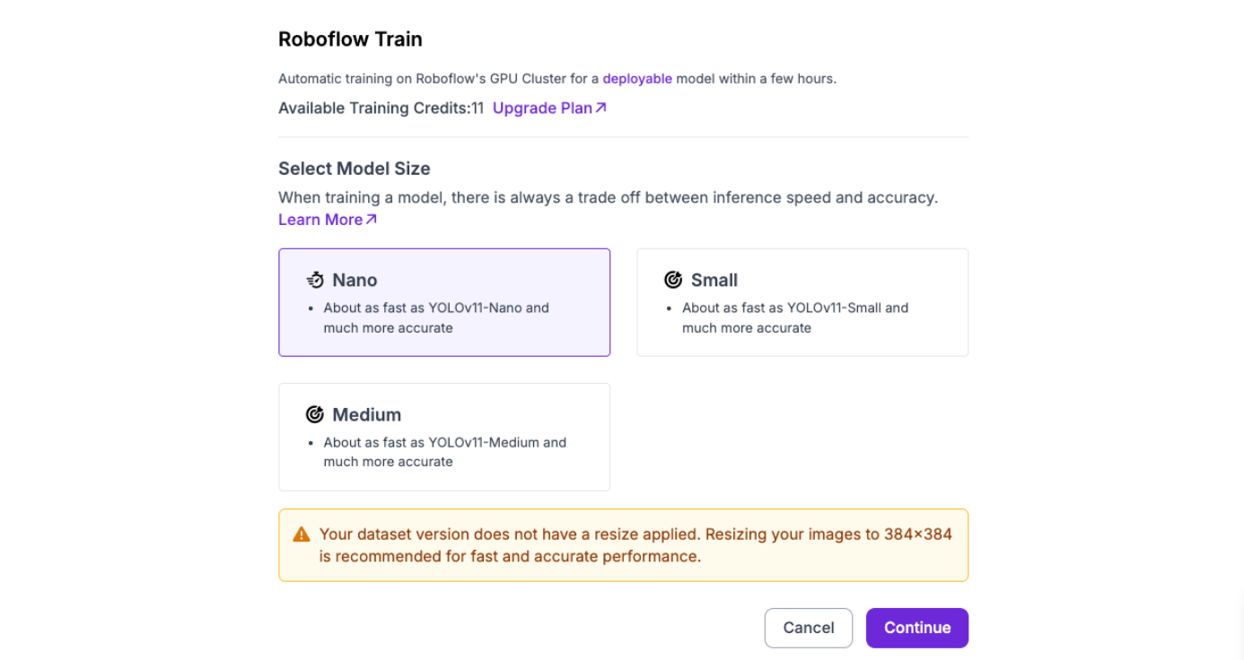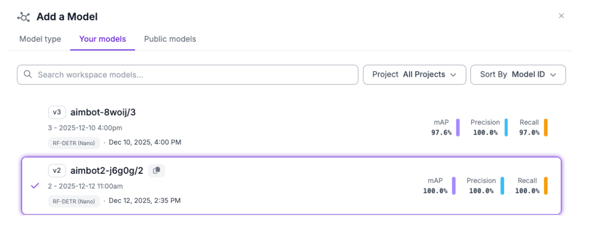 Next, we’ll add the annotated images to the dataset and create a new version to train, with no augmentation or preprocessing steps applied. Since an aimbot is ideally as fast as possible, we’ll be training with RF-DETR Nano, a powerful model with high accuracy and fast inference speed: