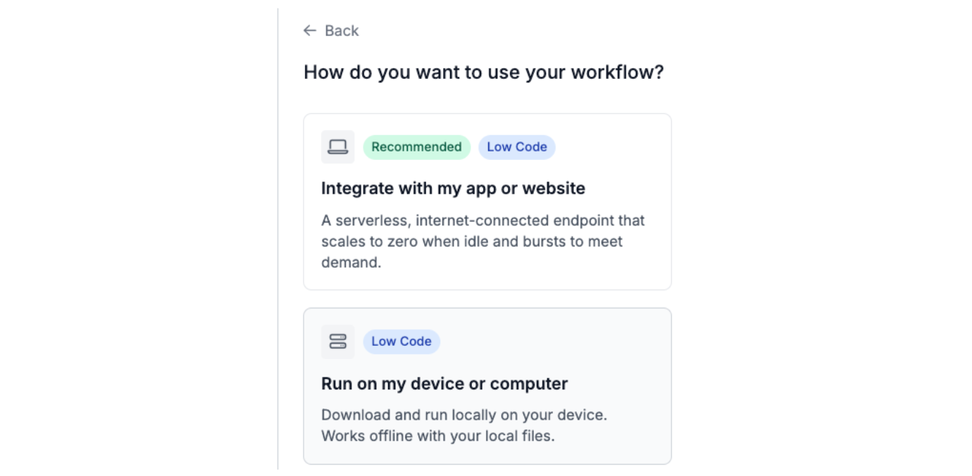 The code snippet provided after allows you to run the workflow after installing Roboflow Inference, the CLI tool for creating a local URL for running your workflow. Make sure to install and set up the Mac or Windows version depending on your OS.