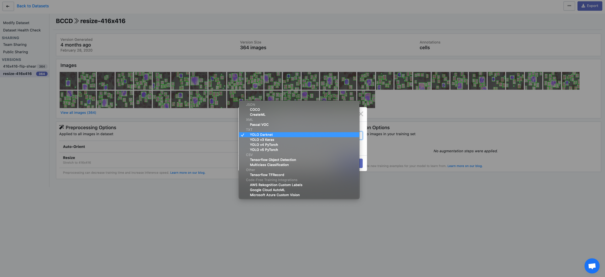 Once your dataset is uploaded, you're directed to the main "Modify Dataset" page. Here, you can apply preprocessing and/or augmentation steps if you like. Note that "auto-orient" and "resize" are on by default. To convert our raw images as-is, turn these off and generate an export.