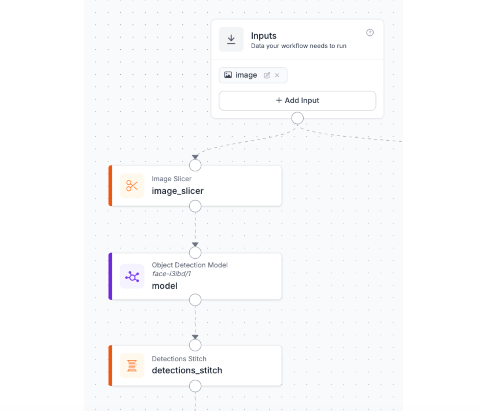The Detection Model, which has been selected from Roboflow Universe, runs on each tile independently. Detections Stitch then does the coordinate remapping. It takes every detection from every tile, converts its coordinates back to the full-frame space, and resolves duplicates. The output is a clean list of detections as if the model had run on the full frame directly, but with the recall benefits of having run on smaller crops.