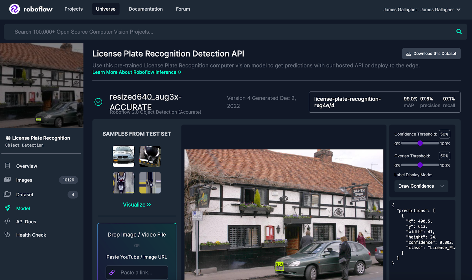 This tutorial uses an open-source license plate detection model, containing over 10,000 images, hosted on Roboflow Universe. To use this model, you’ll need a free Roboflow account. When you create your account, you will be given an API key that you can use to run inference on public models on Universe.