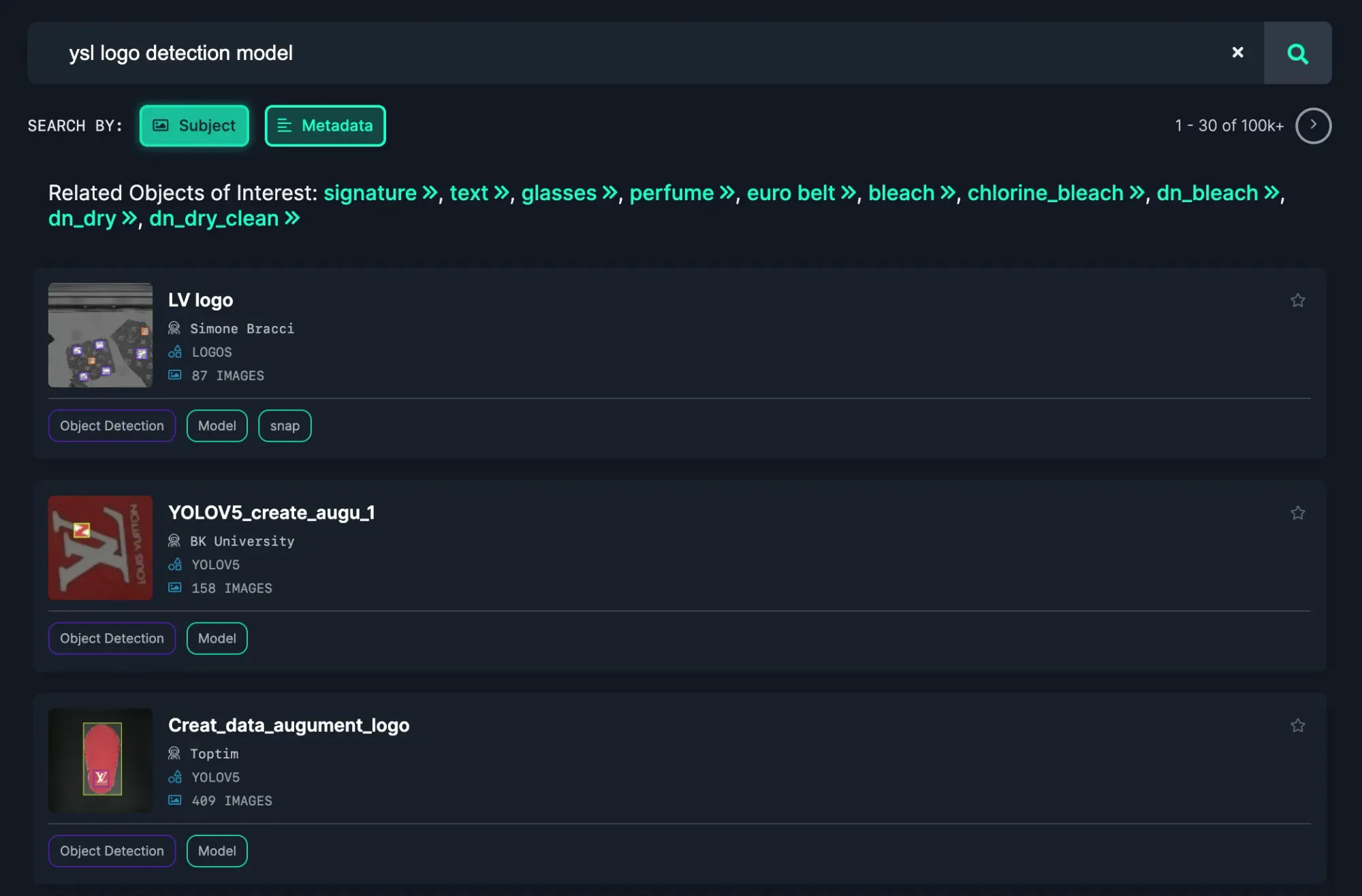 To explore pre-trained logo detection models, go to Roboflow Universe and search for the brand logo of interest.